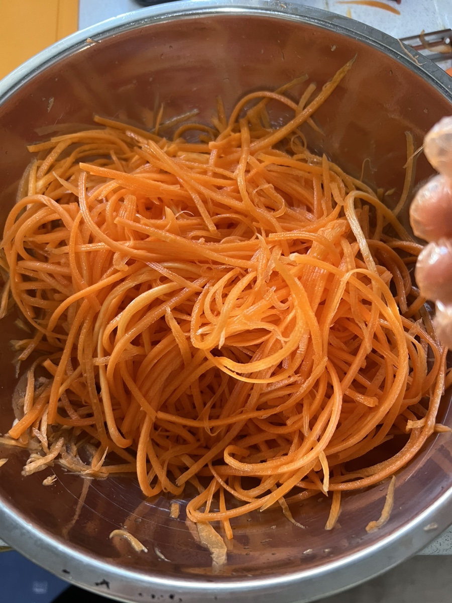 일단 당근을 가늘게 채 썰어서 소금 1t에 절여주었어요!!