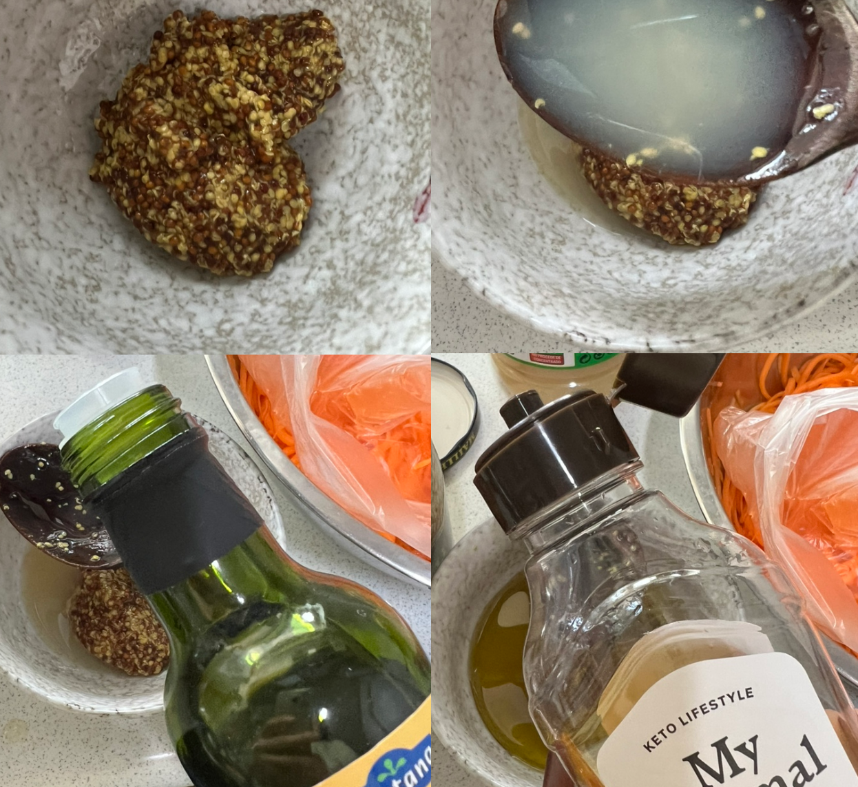 당근 300g 기준으로 홀그레인머스터드 1T, 레몬즙 2T, 올리브오일 3T, 알룰로스 1.5T, 후추 약간이더라고요!!